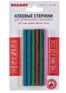 Стержни клеевые REXANT Ø 7 мм, 100 мм, цветные с блестками (12 шт./уп.) (блистер)